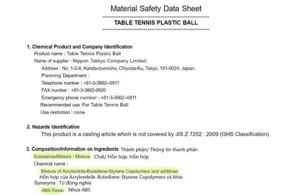 Bảng dữ liệu về vật liệu an toàn sản xuất bóng hãng Nittaku